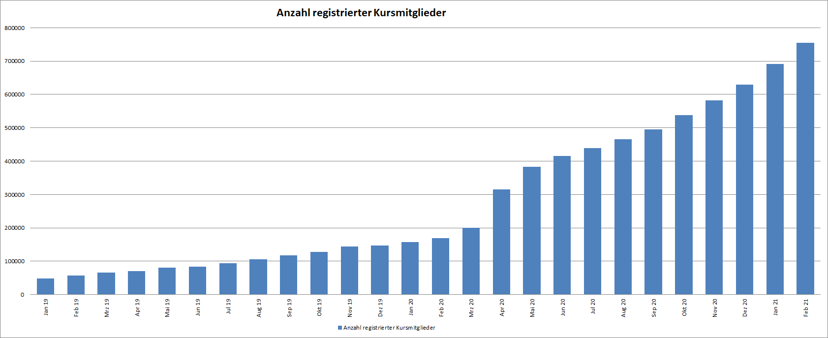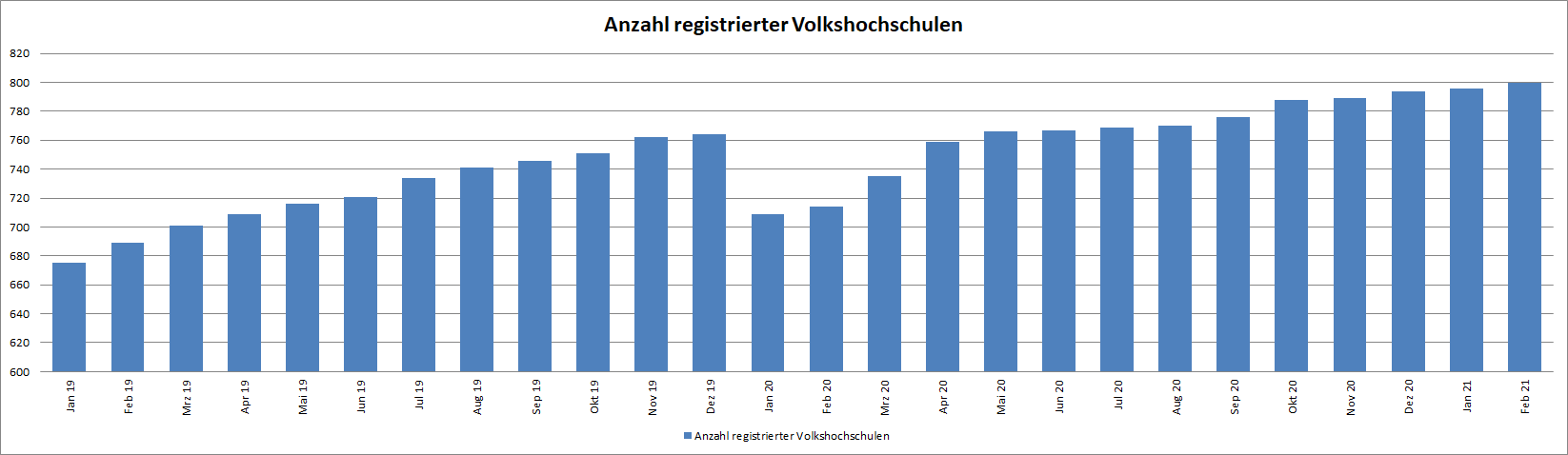 Seit drei Jahren erfährt die vhs.cloud-Community ungebrochenen Zuwachs. Nicht zuletzt die Einschränkungen des Präsenzunterrichts durch die Corona-Pandemie haben die Nutzung digitaler Angebote verstärkt, was auch deutlich in den Statistiken zur vhs.cloud erkennbar ist. Aktuell (Stand Januar 2021) sind knapp 800 Volkshochschulen in der vhs.cloud registriert, 12.000 Volkshochschul-Mitarbeitende, knapp 44.000 Kursleitungen und 750.000 Kursteilnehmende.