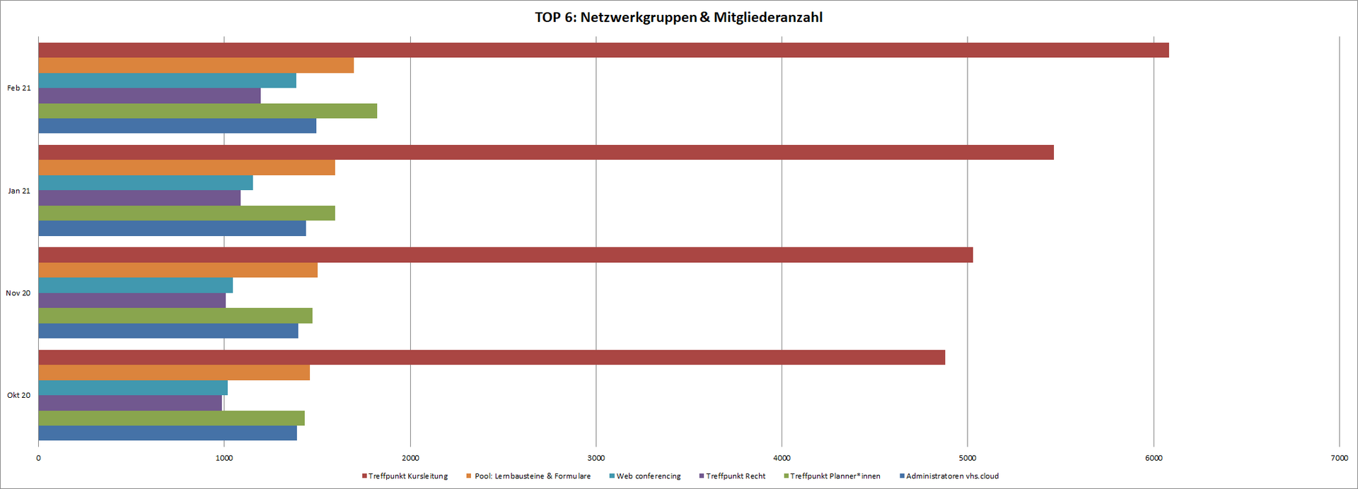 Mit 152 Netzwerkgruppen zu verschiedensten Themenbereichen (z. B. Rund um die vhs.cloud, Digitale Strategien und Instrumente, vhs-Verwaltungsarbeit, vhs-Programmbereichsarbeit, Veranstaltungen & Gremien, Regionale Netzwerk-Gruppen) hat sich ein dichtes, stets wachsendes Netzwerk gebildet, welches Wissen und Expertise bündelt und vor allem teilt. Viele dieser Netzwerkgruppen sind von Mitgliedern der vhs.cloud gegründet worden. Auch zeichnen sich diese Gruppen durch ihre Offenheit und Transparenz aus.