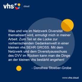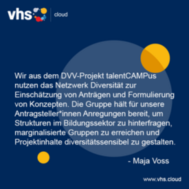 "Unsere Mission ist es, die Volkshochschulen vielfältiger zu machen. Durch regelmäßigen Wissensaustausch, Vernetzung und kritische Reflexion unterschiedlicher Perspektiven schaffen wir einen Diskursraum, um Vielfalt und Inklusion zu fördern und Bildung für alle Menschen zu ermöglichen."